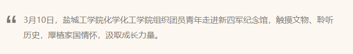 “作为学院理想信念教育的重要一环,此次活动不仅是一次参观,更是一次深度的思想洗礼。”化学化工学院团委书记王灿星表示,“学院高度重视团员青年的思想政治引领,此次将团日活动与新增文物展相结合,正是借助地方红色资源,让青年学生在历史现场感受信仰力量,将新四军革命精神转化为成长成才的内在动力。”
