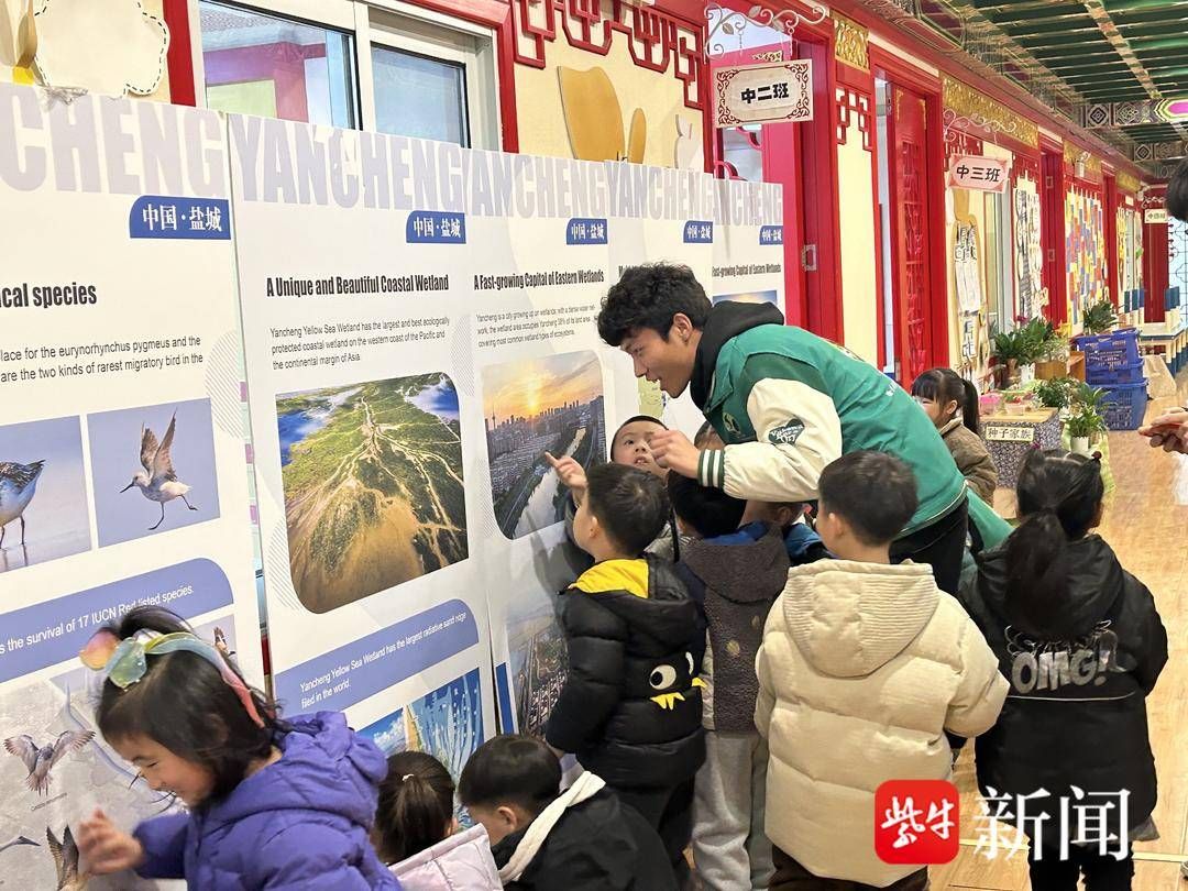 随后,志愿者向小朋友们分发湿地生态保护宣传手册并耐心讲解,一幅幅精美图片记录着大自然的美丽瞬间,也向孩子们传递着保护珍稀濒危动物和栖息环境的绿色生态理念。在教室外走廊,志愿者们精心布置了展现盐城湿地之美的展板,小朋友们齐聚在展板面前,有的自己认真观看展板内容,有的与其他同学交流探讨,还有的向志愿者们积极提问。