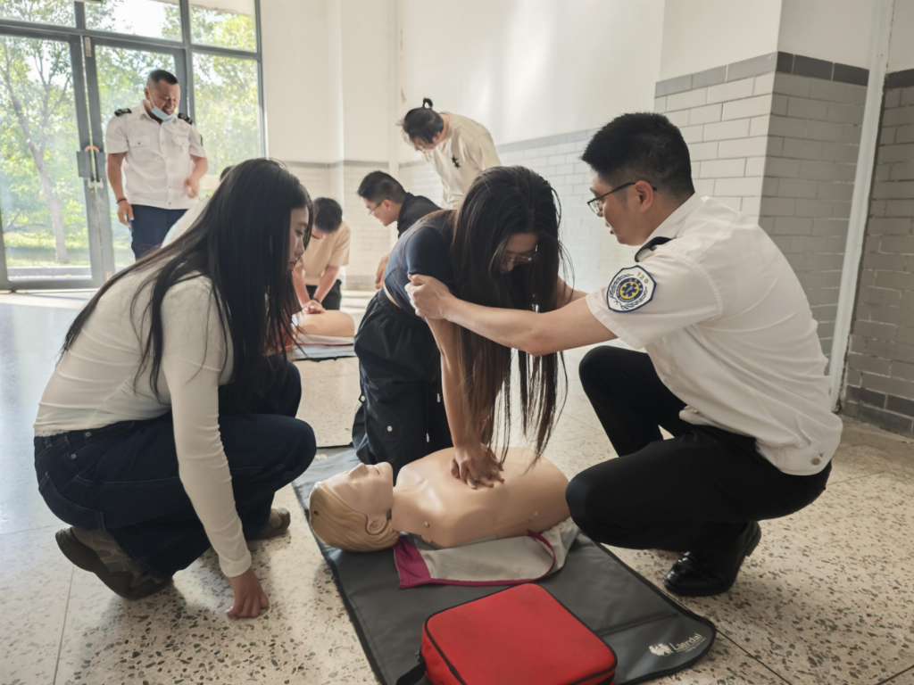 这支志愿者团队的专业性,源于严格的前期培训。盐城市急救中心培训科科长邱国军亲自为志愿者授课,他反复强调:“救命的黄金时刻是最初的4-6分钟。”在培训室里,邱国军通过模拟人实操演示心肺复苏的关键要点,从按压深度到频率,每个细节都讲解得细致入微。针对AED设备的使用,他带领志愿者演练“开机-贴电极-听指令”的标准化流程,确保每个人都能熟练掌握。此外,团队还进行了婴幼儿及成人海姆立克法的分组演练,不同年龄段的施救差异被逐一拆解演示。