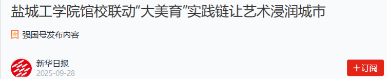近年来,盐城工学院创新构建“大美育”育人体系,与盐城市美术馆、文化馆、图书馆及“言+买”书汇等多家单位深度合作,设立美育实践基地,打造城市文化品牌。“我爱盐”青春艺术周、“墨韵流光·艺启未来”师生作品展、盐城“非遗”进校园、名师美育大讲堂等一系列活动如火如荼地开展。从定期举办公益艺术讲座到组织文化惠民活动,从艺术作品进社区到师生参与城市公共空间设计,盐城工学院始终以“文艺为人民服务”为宗旨,探索美育融入城市发展的新路径,持续不断地将优质艺术资源转化为提升市民审美素养的公共产品,彰显了高校在传承文化根脉、助力文明城市建设中的社会责任。