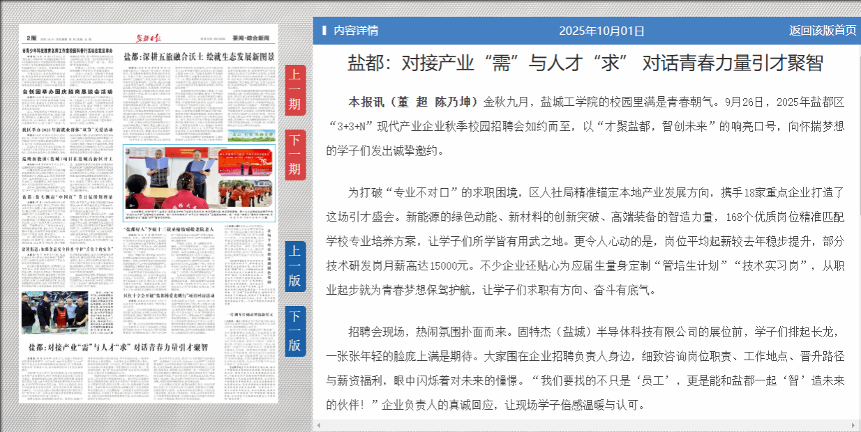 产业的舞台已搭好,政策的诚意已备足,科技的便利已到位;学子们的专业底气正澎湃,创新想法正闪耀,扎根的期待正滚烫。这场双向奔赴的招聘会,不仅打破了就业壁垒,更点亮了青春航向。未来,必将有更多青年人才带着梦想扎根盐都,与这座充满活力的城市并肩前行,共绘“才聚盐都,智创未来”的美好画卷。