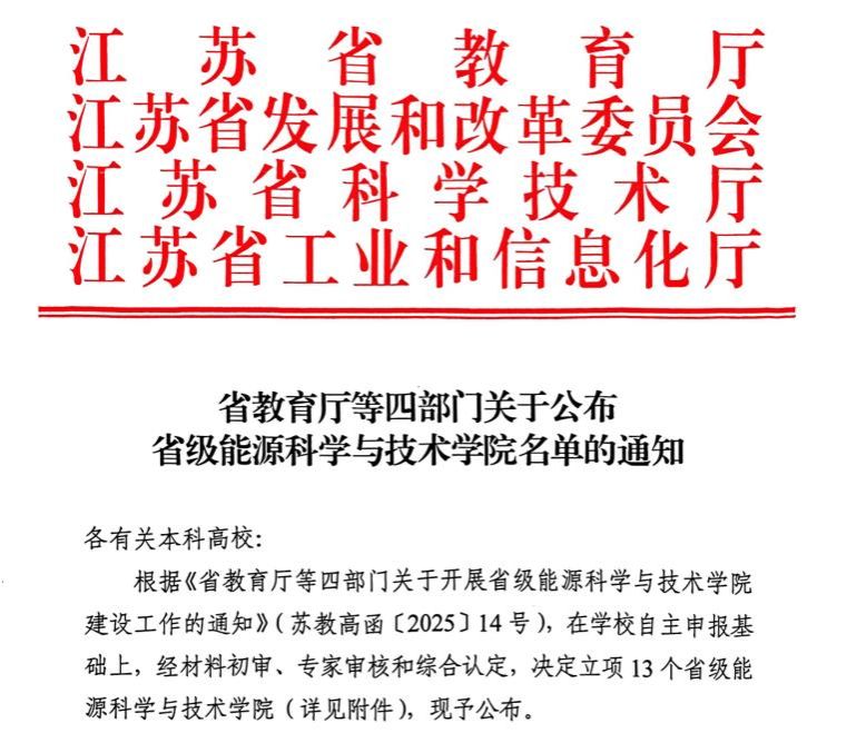 近日,江苏省教育厅、省发展和改革委员会、省科技厅、省工业和信息化厅联合公布省级能源科学与技术学院名单,我校化学化工学院凭借鲜明的服务新能源产业特色成功入选,标志着学校在服务国家能源安全战略、赋能江苏新型能源体系建设及制造业绿色低碳转型的进程中,迈入高质量发展新阶段。