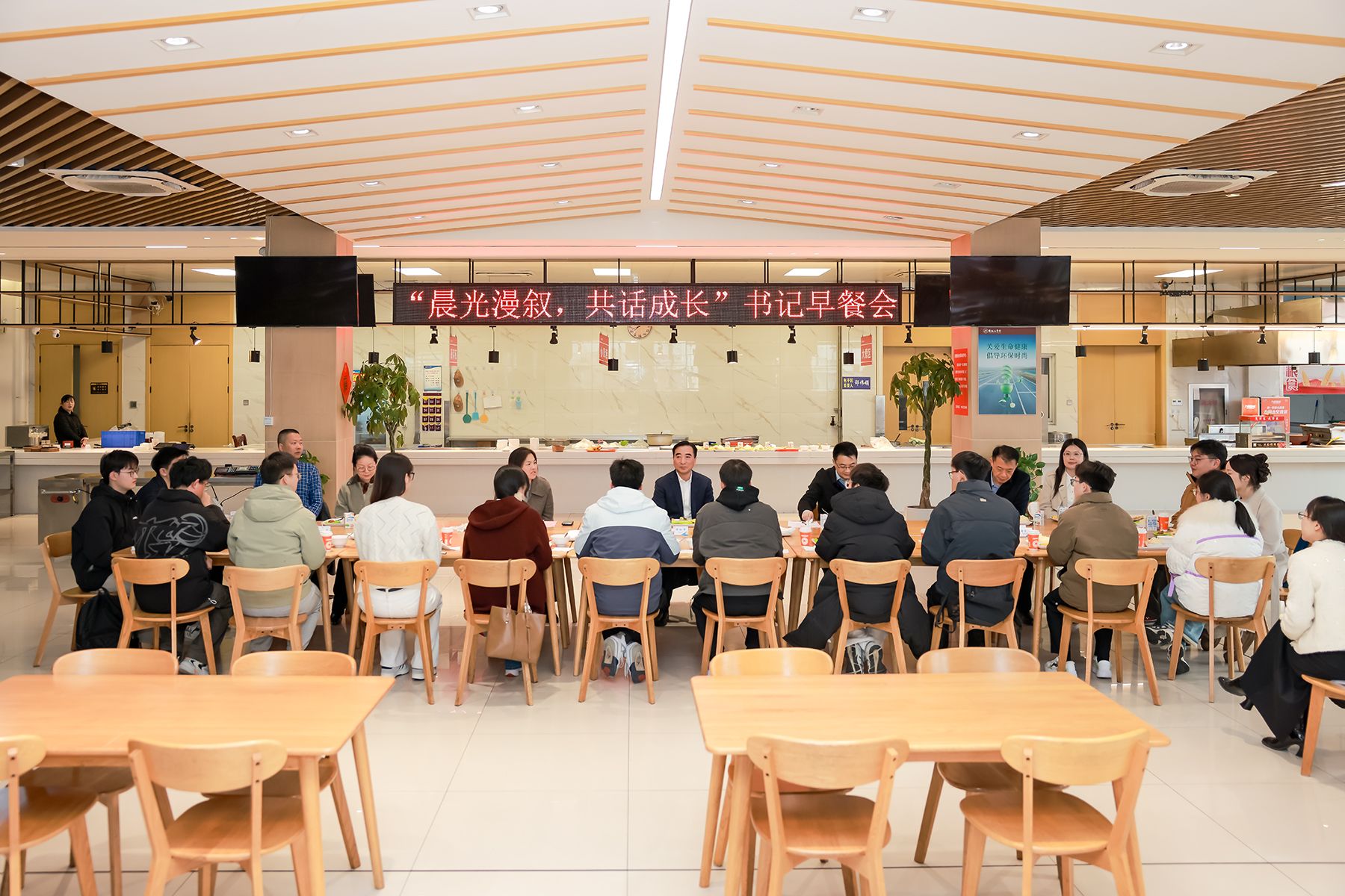 为全面贯彻落实立德树人根本任务,凝聚师生共谋发展的思想共识,3月20日清晨,在希望大道校区教职工餐厅,学校举办“我与书记校长面对面”系列活动之“晨光漫叙,共话成长”书记早餐会。校党委书记周如军,党委常委、副校长王伟、邢晓平出席,与来自各学院的十余名学生代表共进早餐、亲切交流。党办、学生处、团委、教务处等相关职能部门负责人参加。