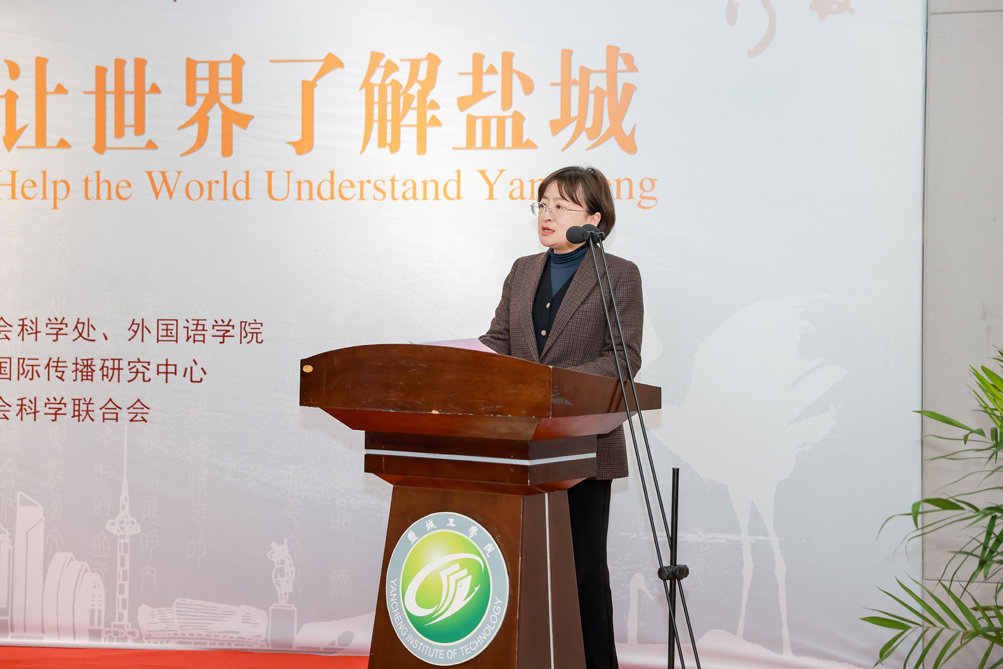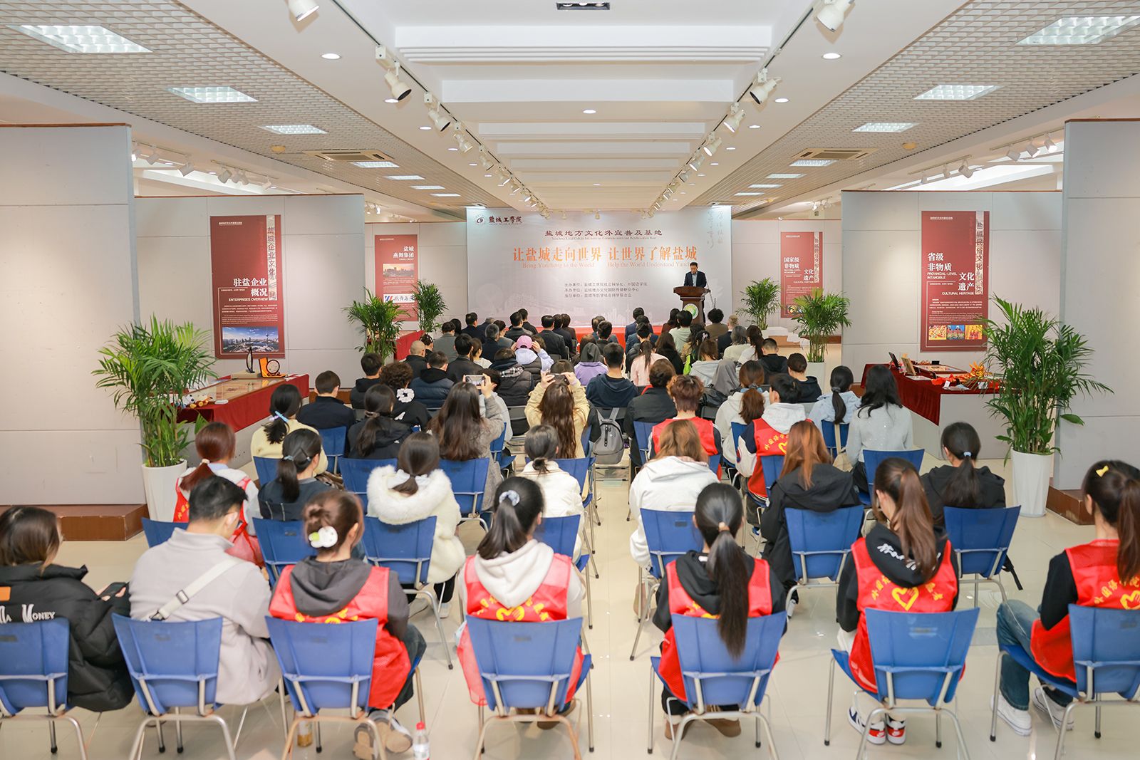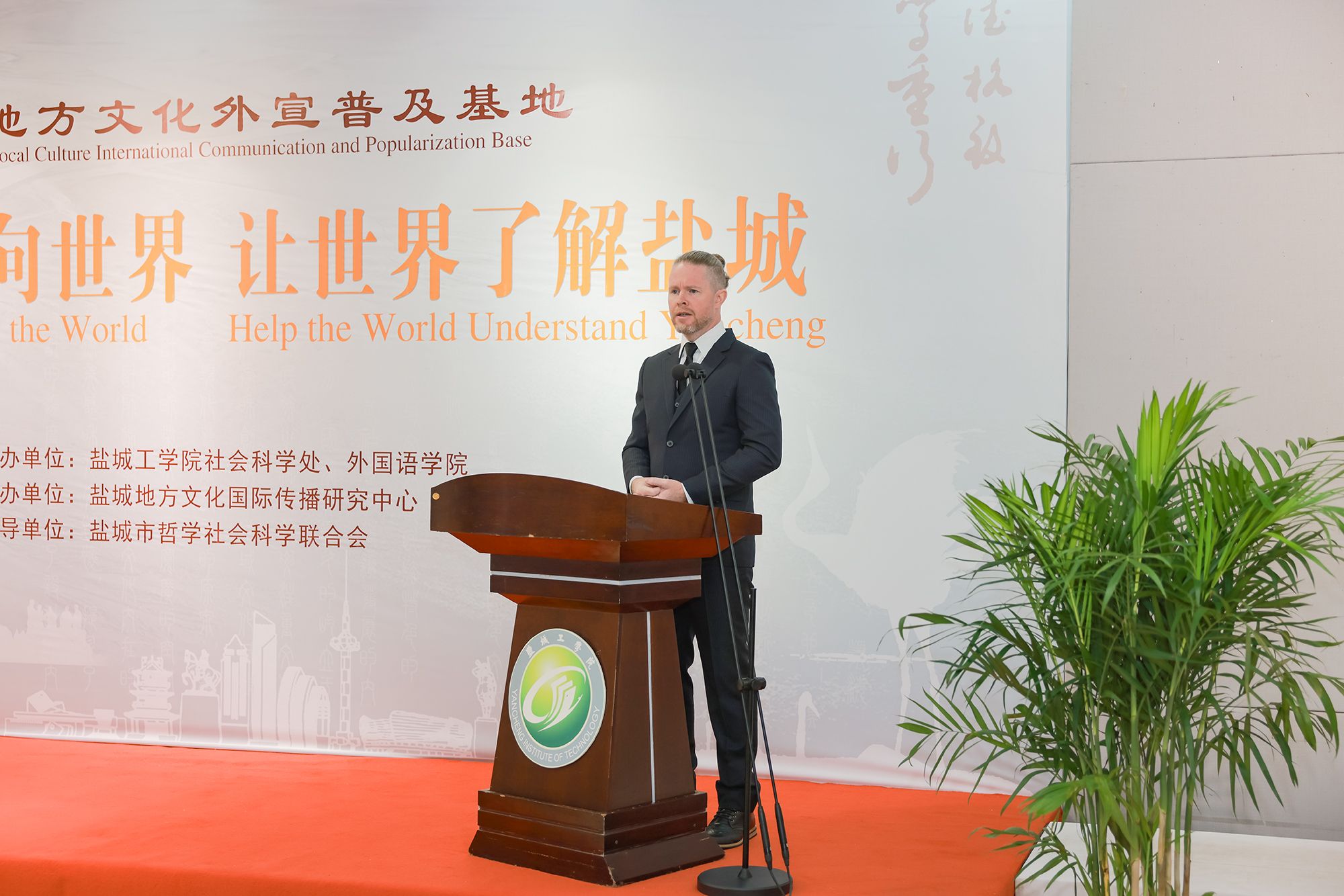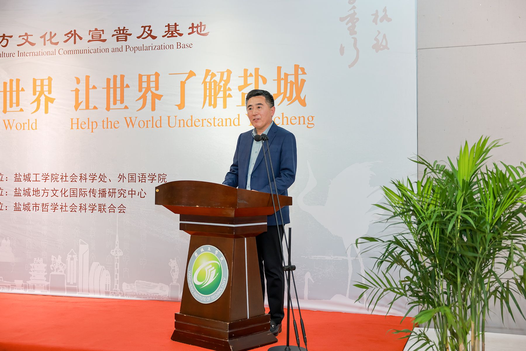 外国语学院院长、基地负责人叶磊介绍基地建设情况。他表示,基地将围绕盐城地方文化挖掘、阐释、翻译与国际传播,构建阵地化、课程化、研究化、常态化社科普及体系,整合特色展厅、精品课程、科研智库、志愿服务四大板块,形成综合性文化外宣平台,努力讲好盐城故事、传播好盐城声音。