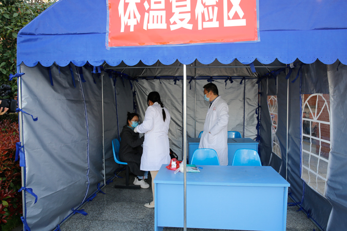 演练采取情景模拟和现场演练相结合的方式,根据返校报到过程中的重点环节和风险点、防控点进行了演练。由政工人员扮演“学生”和“志愿者”,现场模拟了错峰返校时,学生在报到过程中可能出现的6种情景。在“志愿者”的带领下,“学生”按照地面的标识至少保持1米的距离间隔依次等候,必须通过核验信息、检测体温,领取健康证明后才能入住宿舍等流程。