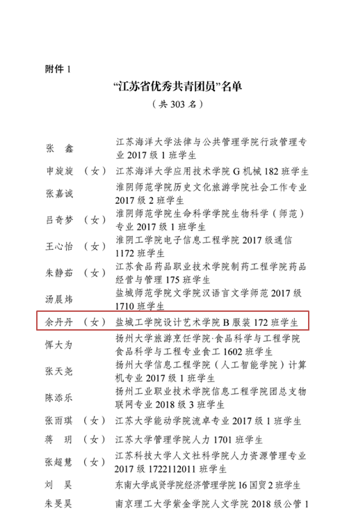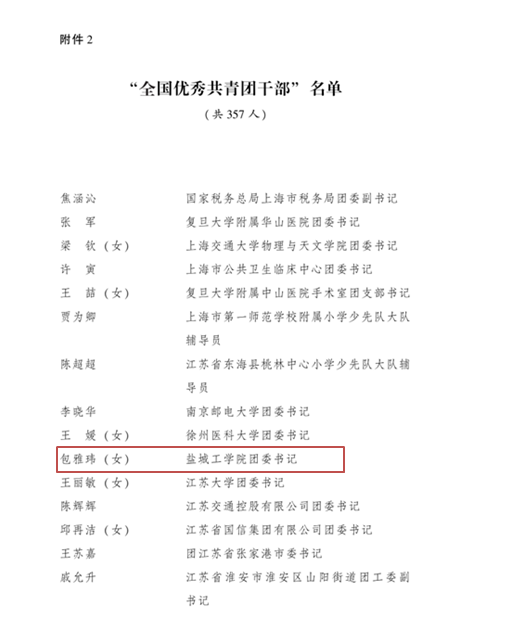 日前,为表彰先进,宣传先进,激励团员、团干部和各级团组织奋发有为、再创佳绩,共青团中央、共青团江苏省委分别下发了《共青团中央关于表彰“全国优秀共青团员”“全国优秀共青团干部”“全国五四红旗团委(团支部)”的决定》(中青发[2020]8号)、《关于表彰“江苏省优秀共青团员”“江苏省优秀共青团干部”“江苏省五四红旗团委(团支部)的决定”》(团苏委发[2020]8号)。我校团委书记包雅玮荣获“全国优秀共青团干部”荣誉称号,设计艺术学院B服装172班余丹丹同学荣获“江苏省优秀共青团员”荣誉称号,共青团盐城工学院委员会荣获“江苏省五四红旗团委”荣誉称号。其中,“全国优秀共青团干部”是共青团中央授予团干部的最高荣誉,全国有357名团干部获此奖项。
