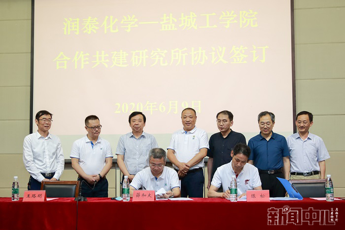 副校长王路明与润泰化学股份有限公司董事长张世元共同为“润泰化学盐城工学院成膜助剂研究所”揭牌