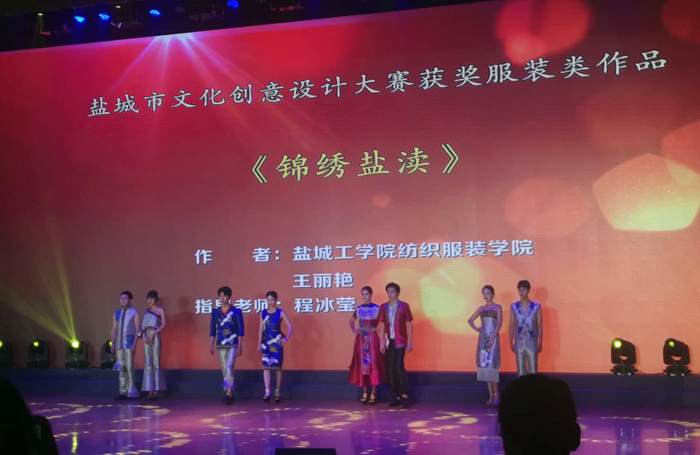 纺织服装学院程冰莹指导,王丽艳同学的文创产品创意设计服装作品《锦绣盐渎》在颁奖现场展示