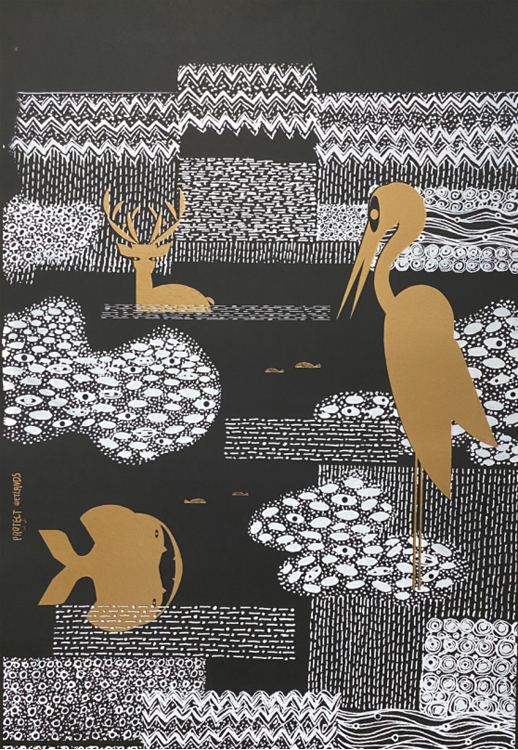 盐城市第一小学的一名美术老师胡萍也作为学员参加了本次活动,并学习了丝网印刷海报设计的全过程,感触颇深。她的以“共生”为内涵的海报,分别以“鹤”、“鹿”为原型结合生态主题。她说,与设计大咖导师和全国高校的老师、学员一起走进湿地寻找素材,受益匪浅。“我平时擅长国画,学习的丝网印刷技术,正好是版画的另一种表现形式。通过导师的指点,运用国画表现手法设计出含有中国水墨味的丝网海报。相信在我以后的教学中如何培养孩子们的想象力,一定会学以致用的。”