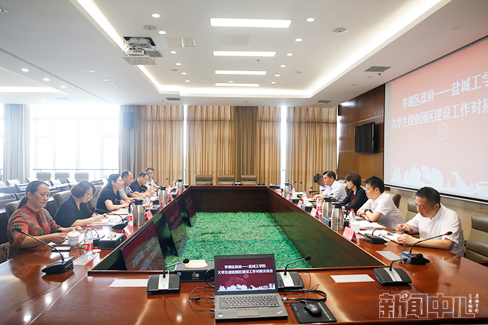 8月26日上午,盐城市亭湖区区长盛艳、副区长朱杰成、亭湖区环保科技城管委会副主任郁荣、政府办主任支云峰、人力资源和保障局局长周亚民等来校交流对接亭湖区政府和盐城工学院共建大学生创业园区等工作。校长方海林,党委常委、副校长邵荣,党委常委、宣传部部长韩雅丽和校办、学生处、科技处等部门负责人参加交流会。