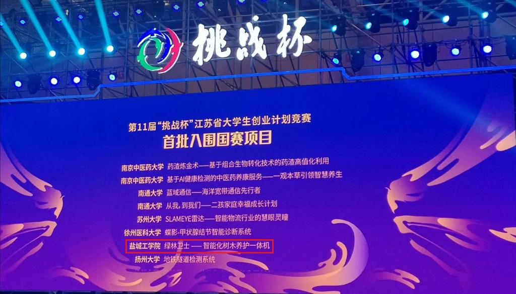 其中,机械优集学院郁倩、信息工程学院孟海涛、经济管理学院陈爱成老师共同指导,信息工程学院2020届毕业生王闯等同学的《绿林卫士——智能化树木养护一体机》作品荣获省赛金奖;海生学院聂庆、吕富、经济管理学院王奇杰老师共同指导,海生学院B海洋183班刘鹏等同学的《虾蚕恋》作品获得省赛银奖;经济管理学院卞保武、学生处谢莹老师共同指导,人文社会科学学院B酒店181班李琦等同学的《盐城市心灵绿洲心理服务中心》,学生处徐新华、土木工程学院王延树、经济管理学院杨军老师共同指导,土木工程学院B工管181班贾涵语等同学的《“舆”你共商》,化学化工学院蔡照胜、李慧、黄旭娟老师共同指导、化学化工学院B制药172班徐鹏等同学的《润农牧保—畜禽免疫强化剂吡啶甲酸铬生产技术引领者》等3件作品获得省赛铜奖。