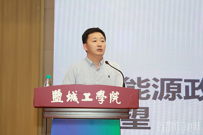 活动第二阶段为专题报告。国家能源局江苏监管办公室市场监管处处长吴卫建为现场人员作了《新能源政策与发展展望》的专家报告,他解读了国家新能源政策与发展展望,介绍了江苏新能源发展面临的挑战、消纳监管,对盐城新能源产业发展及盐城工学院新能源学科建设与人才培养提出了建议和意见。
