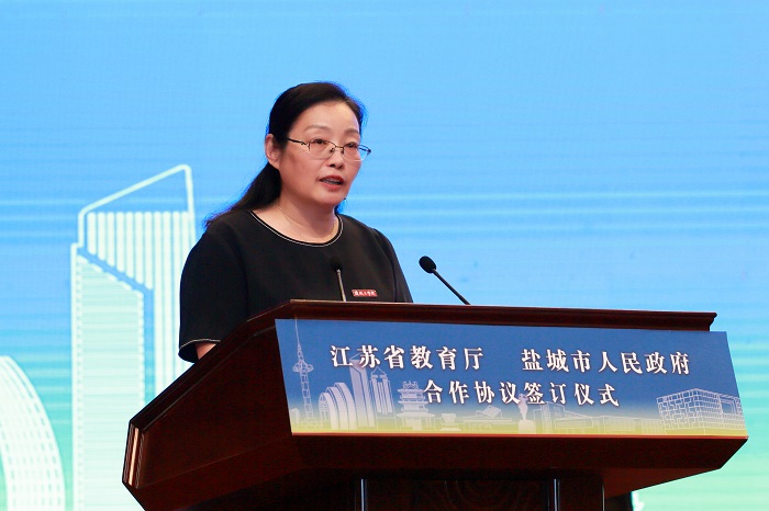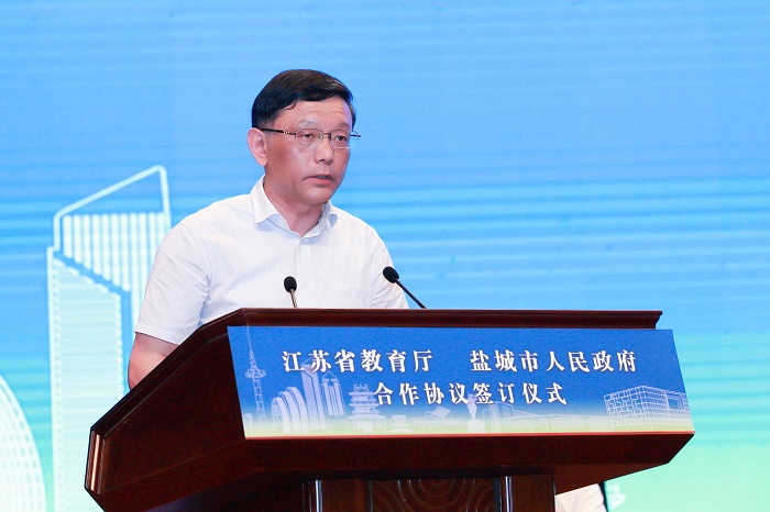 省教育厅副厅长潘漫与盐城市副市长费坚分别代表江苏省教育厅、盐城市人民政府在“关于推进盐城工学院建成国内高水平应用型大学的深化合作协议书”上签字。