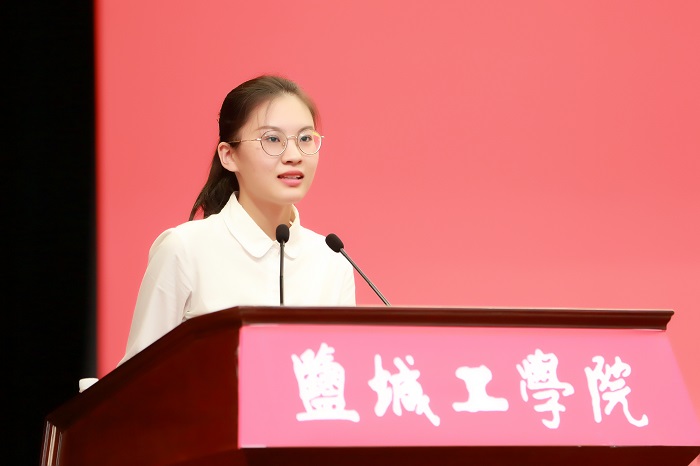 学生代表、盐城市优秀共青团员、校十佳青年志愿者、校三好学生、校团委学生兼职副书记、人文社会科学学院B中文181班许欣雨同学致感谢词