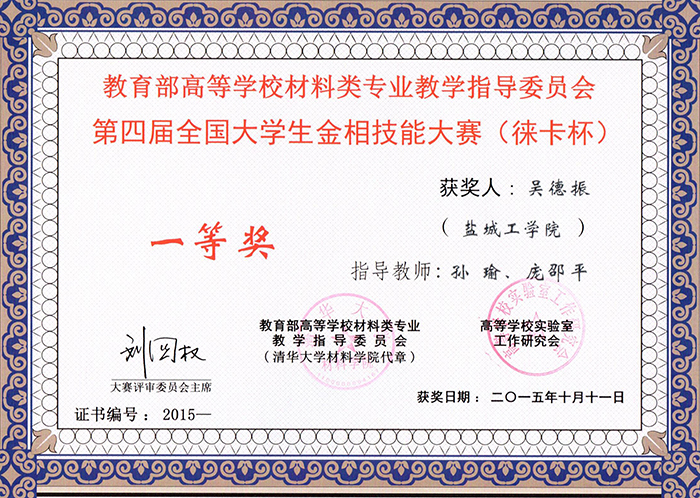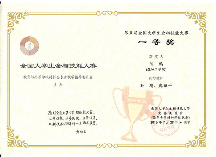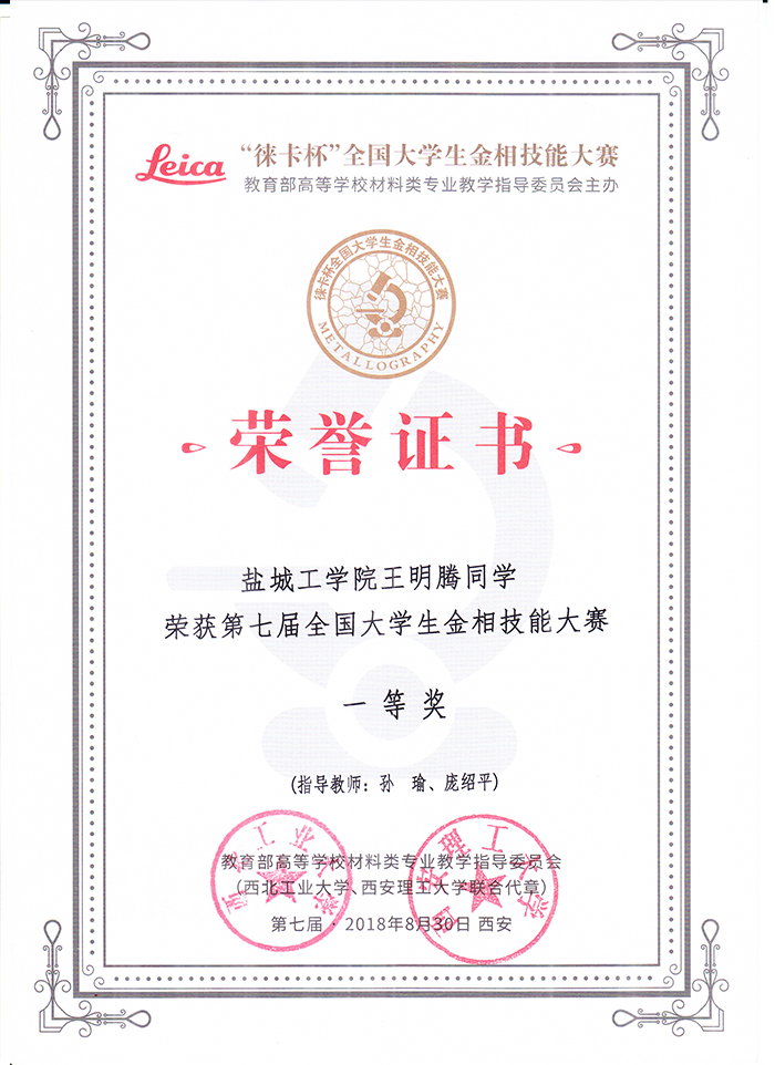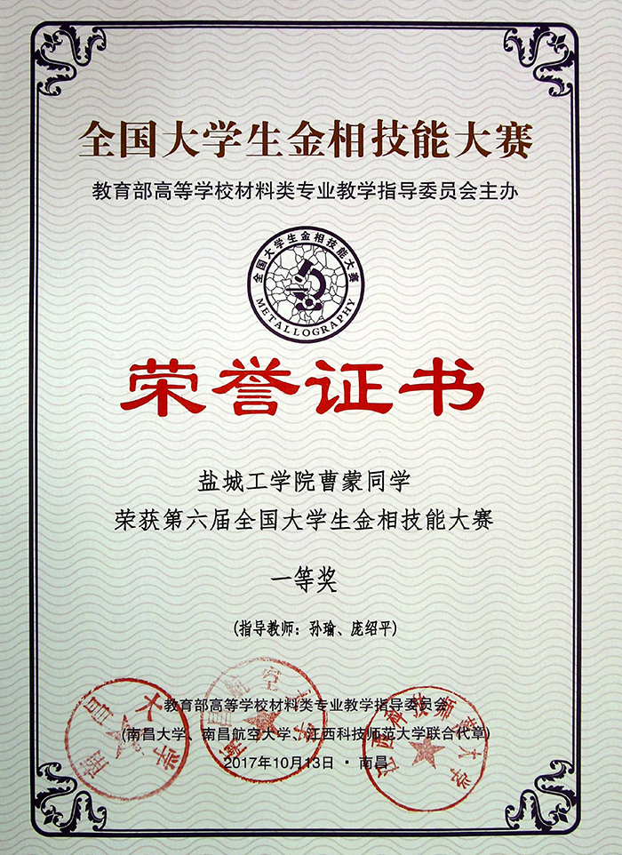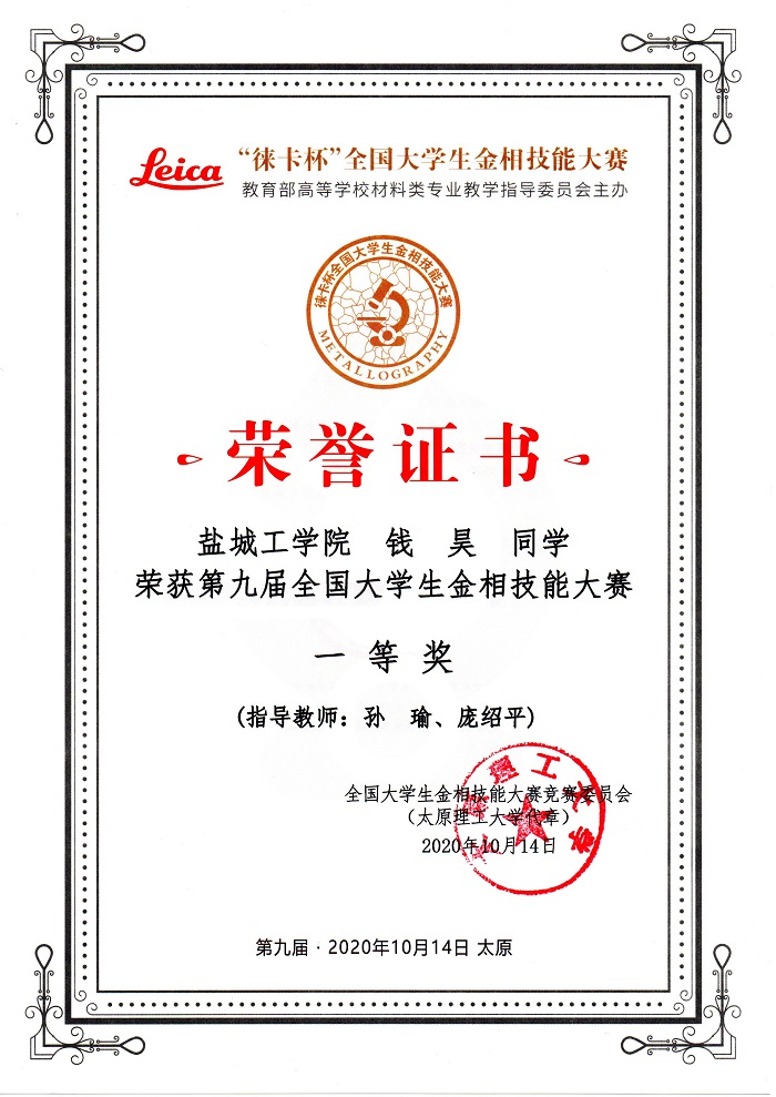 10月9日至14日,“徕卡杯”第十届全国大学生金相技能大赛在上海交通大学举行。我校材料科学与工程学院张纪元同学获得一等奖,聂新怡、王中发同学获得二等奖。材料学院孙瑜、庞绍平、宋娟3位老师获得“优秀指导教师”称号。大赛授予孙瑜老师全国大学生金相技能大赛十周年一级荣誉勋章。至此,我校学生已连续7年获得该赛事一等奖。