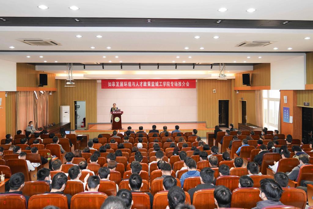 为加强用人单位与学校毕业生求职的精准对接,推进高质量就业工作,根据如皋发展对人才的需求,10月21日下午,“两在两同建新功·校政企协同促就业”专场招聘会暨如皋发展环境与人才政策盐城工学院专场推介会在希望大道校区机械馆报告厅举行。校党委常委、副校长邵荣,如皋市人力资源和社会保障局党组书记、局长胡晓勇,副局长周昌峰出席。如皋市招聘单位30余名代表、我校招生与就业创业指导处负责人、二级学院分管学生工作副书记、学工办主任、毕业班辅导员以及2022届毕业生代表等300余人参加活动。招生与就业创业指导处处长徐新华主持会议。