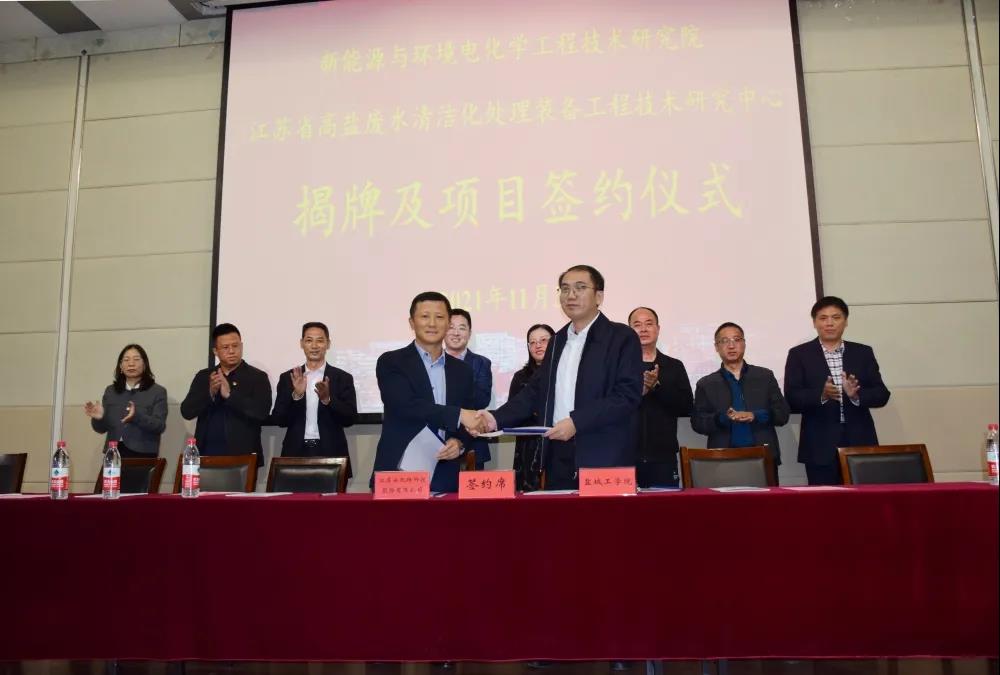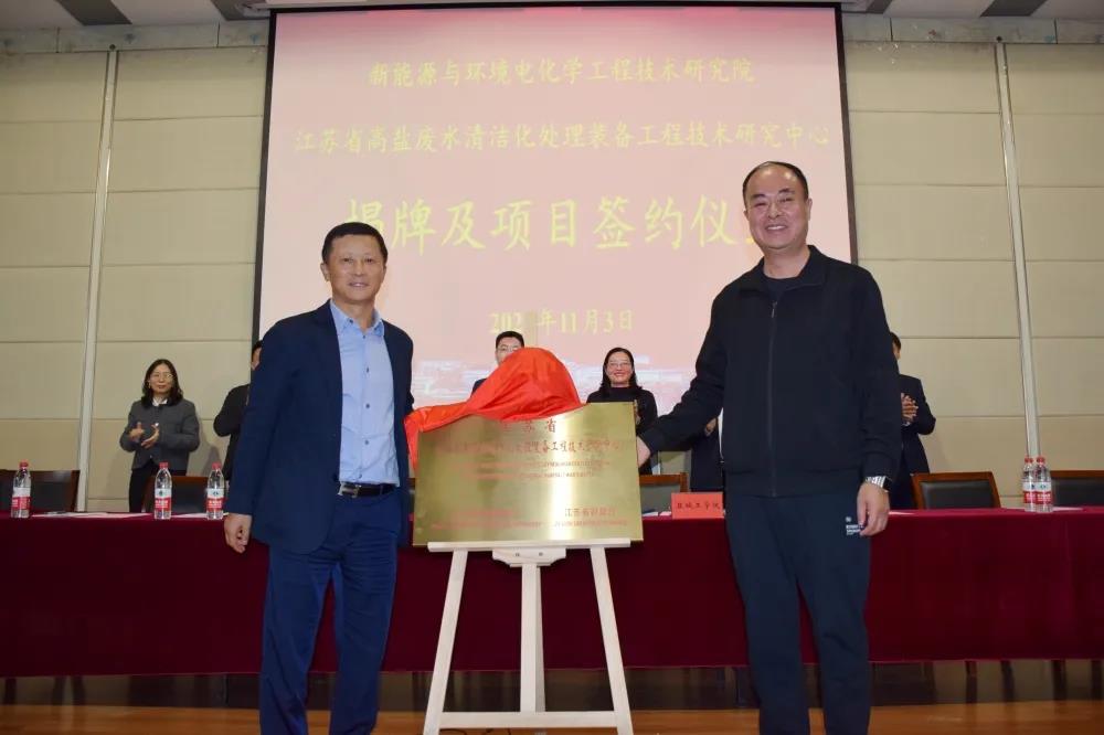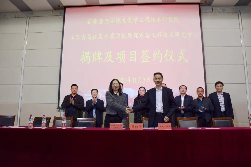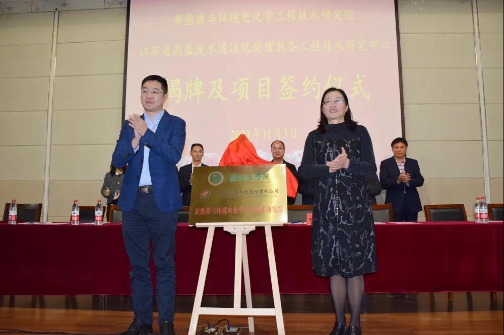 11月3日下午,江苏安凯特科技股份有限公司与我校合作共建“新能源与环境电化学工程技术研究院”暨“江苏省高盐废水清洁化处理装备工程技术研究中心”签约与揭牌仪式在我校化工楼报告厅隆重举行。党委副书记、校长方海林,党委常委、副校长邵荣,月城镇党委副书记、镇长盛达,江苏安凯特科技股份有限公司董事长徐文新、总经理助理陈燕芳,科技处处长丁成,月城镇的5个企业相关人员,校长办公室、科技处和化学化工学院领导,机械工程学院和化学化工学院教师和学生代表等出席。仪式由化学化工学院院长戴勇主持。