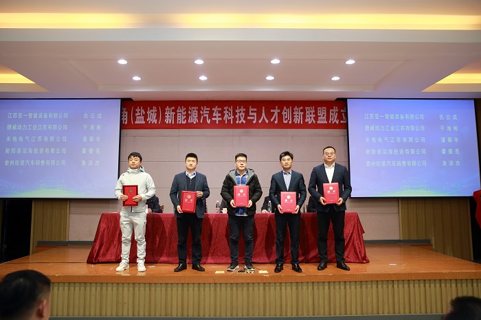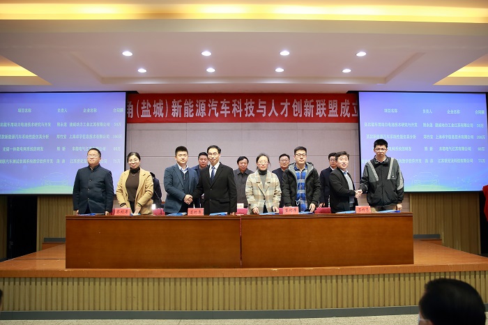 王路明和邓既明共同为长三角(盐城)新能源汽车科技与人才创新联盟揭牌。主席台嘉宾向理事长单位、秘书长单位和8家副理事长单位授牌,向5名联盟产业教授颁发聘书。8家成员单位与我校现场签约了4项产学研合作项目和4项人才培养项目。