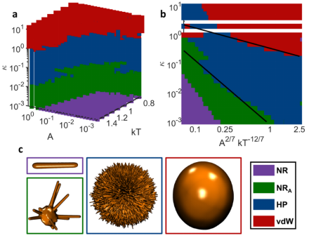 图1自组织粒子相图:(a)三维立体图;(b)二维平面图,(c)各组装粒子形貌。