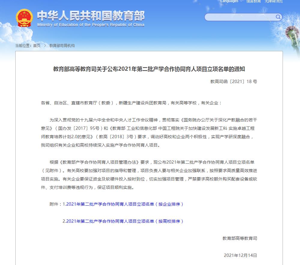 教育部产学合作协同育人项目旨在通过政府搭台、企业支持、高校对接、共建共享,深化产教融合,促进教育链、人才链与产业链、创新链有机衔接,以产业和技术发展的最新需求推动高校人才培养改革。