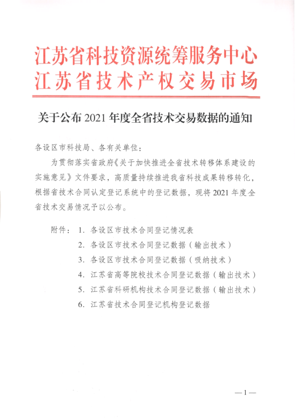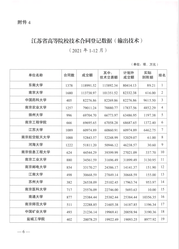 近日,江苏省科技资源统筹服务中心、江苏省技术产权交易市场联合发布了《关于公布2021年度全省技术交易数据的通知》。根据数据统计,我校在全省115所统计高校中技术合同成交额列第19名,成交额达2.01亿元;技术交易额列第15名,交易额达1.99亿元;上述排名在苏北省属高校中均位居首位,同类高校中仅次于南京工程学院。