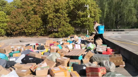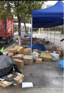 校园快递在校外集中收件,校门外设置临时交接场所,按照收件时间和派送地点分批次、分区域有序摆放,集中消杀,静置3 天以上后再分发,分发完成后才允许进下一批快件,为提高派件速度,在快递分发日,发动群体力量,由快递点向学生提供消毒用品、一次性手套等防护用具,学生在做好个人防护前提下现场拆开快件,外包装由快递点回收后学校按照医疗废弃物专业处置。