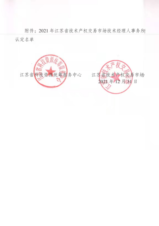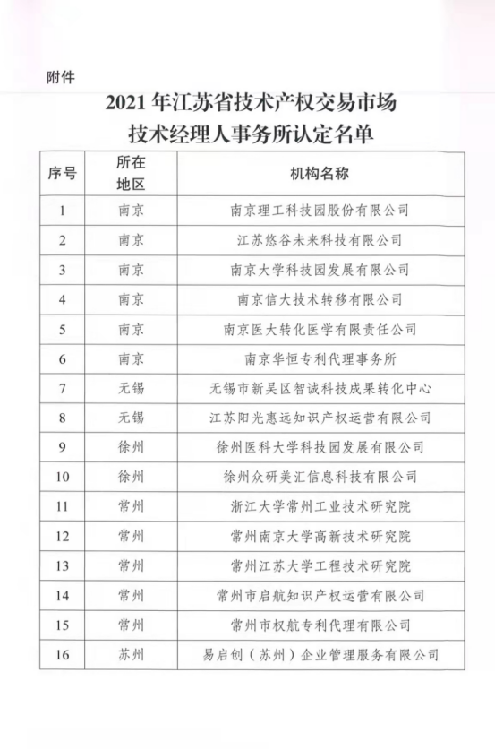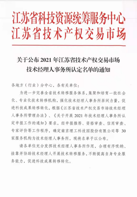 近日,江苏省科技资源统筹服务中心联合江苏省技术产权交易市场联合下发《关于公布2021年江苏省技术产权交易市场技术经理人事务所认定名单的通知》,盐城大学科技园有限公司经申报推荐、资格审查、信用审查及专家评价等程序成功入选为江苏省技术产权交易市场技术经理人事务所。