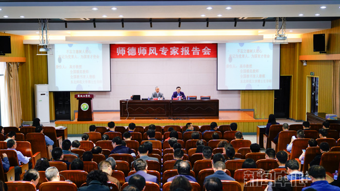 5月11日下午,学校邀请全国教书育人楷模、东北师范大学高夯教授作客我校师德大讲堂,为教师作题为“不忘立德树人初心,牢记为党育人、为国育才使命”的专题报告。副校长魏少华主持报告会,各二级学院(部)党政负责人、教科研办公室主任、专业系主任、实验中心主任、课程组组长、教师代表及2020年新入职教师近300人聆听报告。