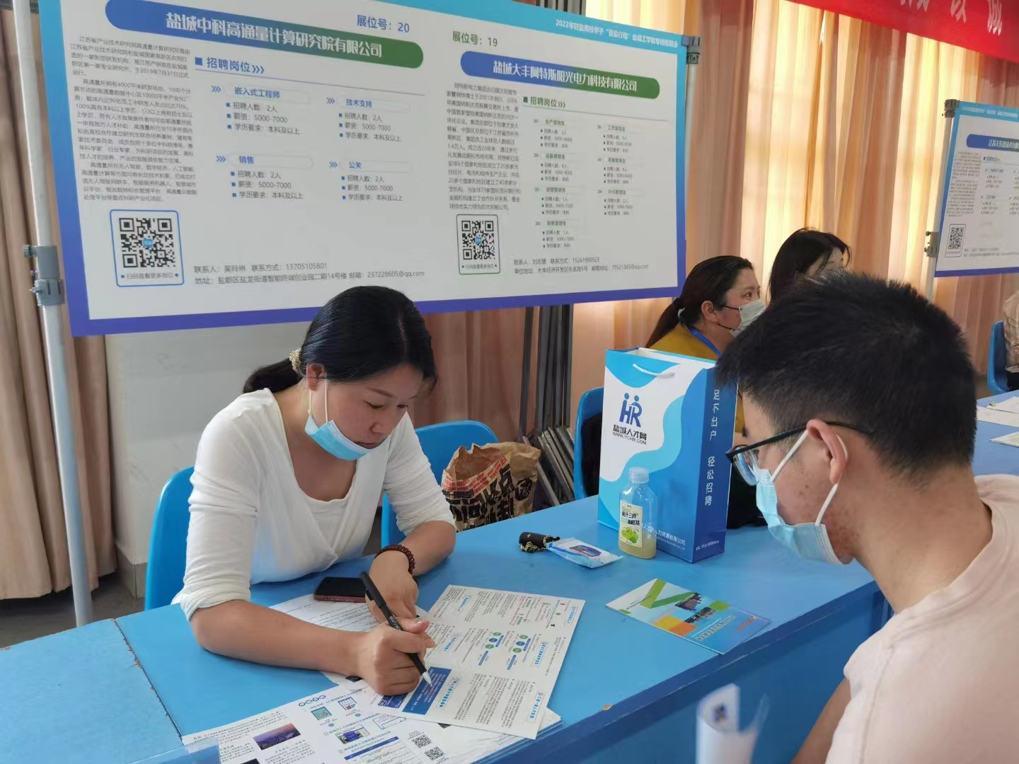 招聘会现场,邵荣分别与校招企业代表盐城市城市资产投资集团有限公司、盐城维信电子有限公司、江苏国瑞液压机械有限公司、盐城中科高通量计算研究院有限公司等单位负责人亲切交谈,详细了解企业人才需求状况,并结合招聘岗位向企业推荐相关专业毕业生。盐城维信电子有限公司招聘主管表示,非常感谢学校对招聘工作的大力支持,希望今后能将有关招聘工作前置,选择对口专业开展联合培养工作,探索稳定、长期的供需模式。