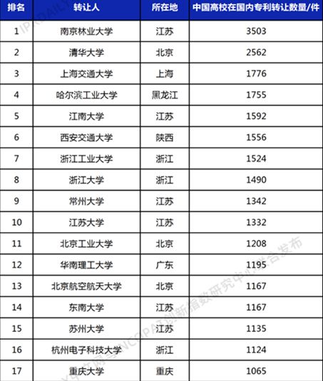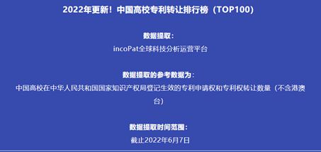 该排行榜统计截至2022年6月7日,中国高校在中华人民共和国国家知识产权局登记生效的专利申请权和专利权转让数量,包括发明、实用新型及外观设计专利。