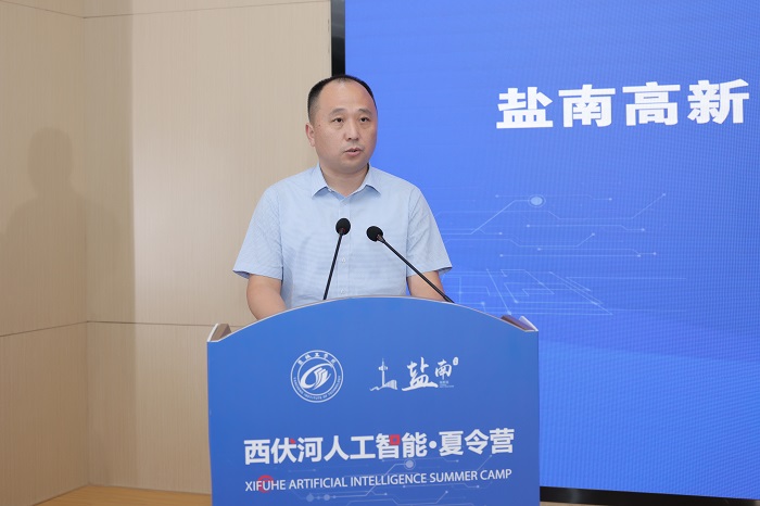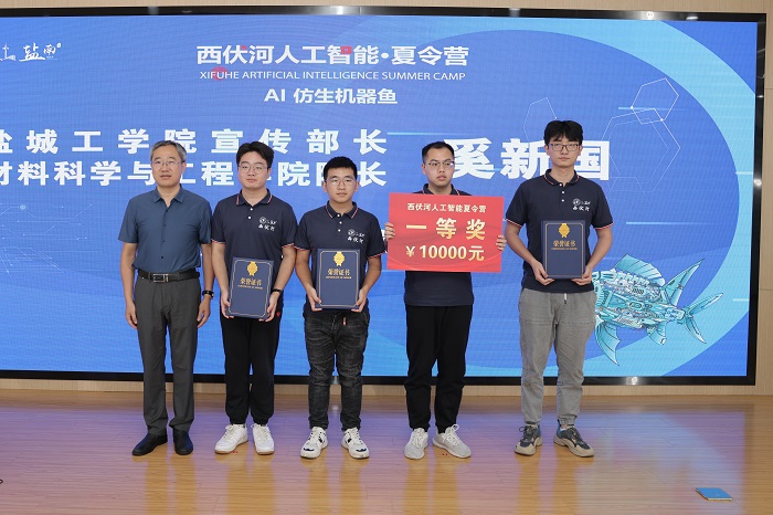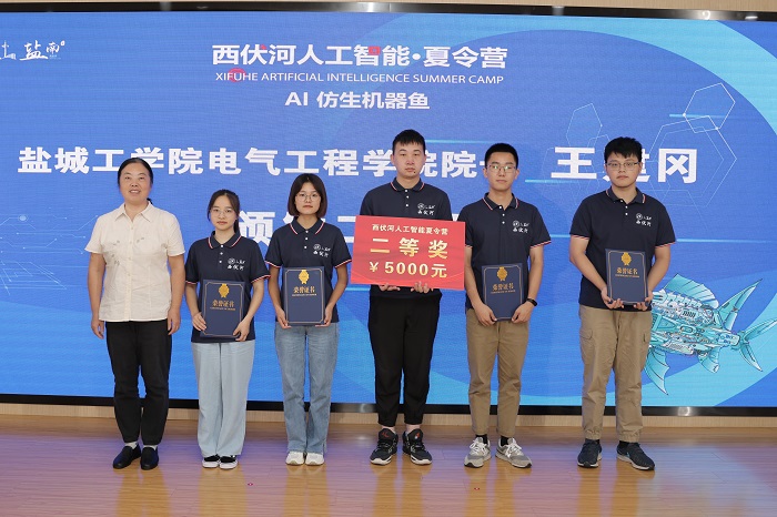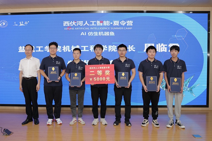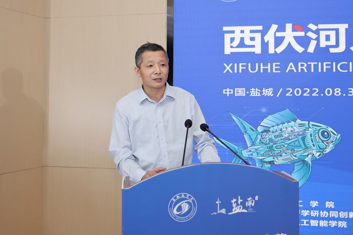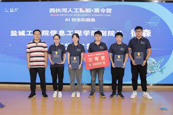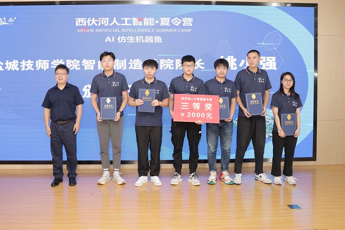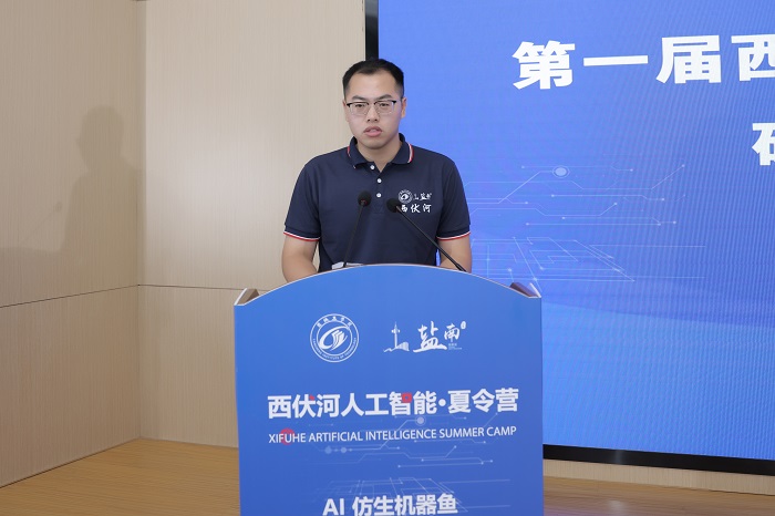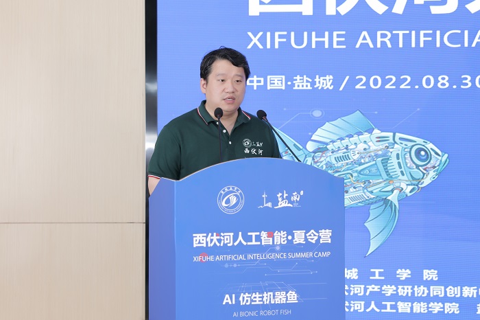 丁成代表学校致辞。他说,西伏河人工智能学院自成立以来,围绕培养“能力硬核+素质全面”的高水平技术人才,以市场需求为导向,以企业技术为命题,正在聚力打造一批兼具前沿性、创新性和交叉性的人工智能课程,建设一支拥有丰富实践经验和深厚理论功底、具有国际视野的一流师资队伍,人工智能人才培养体系不断完善。西伏河人工智能夏令营是我校深化校地融合发展、推进政产学研协同创新的一次有益尝试和创新举措。此次西伏河人工智能夏令营激发了同学们对人工智能、大数据、物联网等新一代ICT技术的热情,同学们围绕仿生机器鱼开发制作实物,攻关研究关键技术,初步形成了一批具有创新效应的知识产权成果。下一步,西伏河人工智能学院、人工智能产业研究院将进一步聚焦盐南人工智能产业,梳理人工智能企业的技术需求、产业需求和人才需求,开展西伏河人工智能论坛、西伏河人工智能大讲堂、西伏河人工智能职工培训学校、西伏河人工智能竞赛俱乐部等一系列活动,将西伏河打造成为我校产学研融合发展、校政企协同育人的靓丽名片。