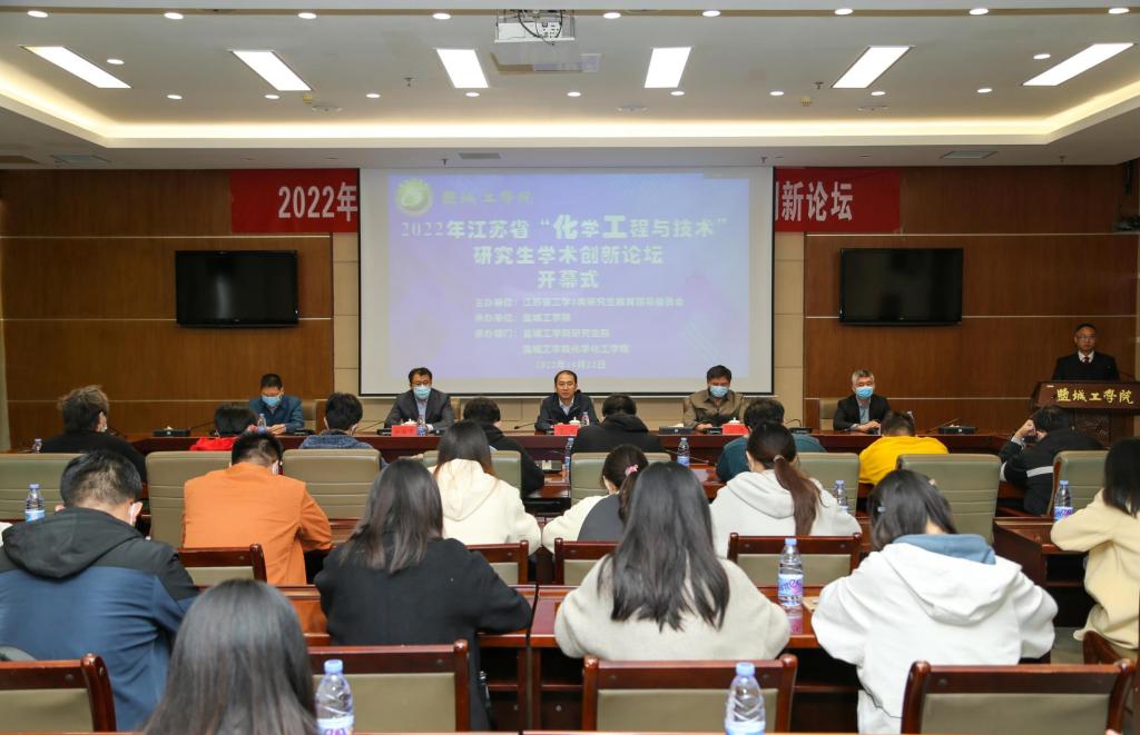 10月22日上午,2022年江苏省“化学工程与技术”研究生学术创新论坛开幕式在我校希望大道校区行政楼9楼会议室举行,本次论坛由江苏省工学3类研究生教育指导委员会主办,我校研究生院和化学化工学院共同承办,论坛以线上线下相结合的方式进行。中国工程院院士蒋剑春、南京理工大学钟秦教授、南京工业大学范益群教授、扬州大学庞欢教授等校外专家线上作学术报告。盐城市政协副主席、我校副校长丁成教授致辞,江苏省研究生工学3类教育指导委员会副主任委员范益群教授线上致辞。学校相关学院负责人及全省相关专业研究生参加本次论坛开幕式。开幕式由化学化工学院院长戴勇教授主持。