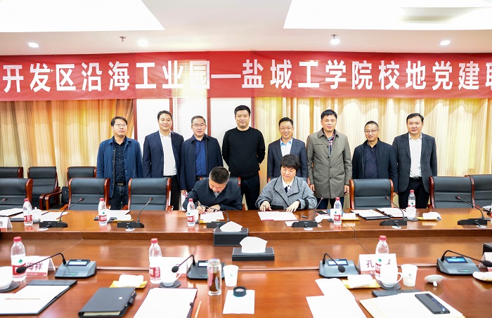 校党委常委、党委组织部部长邢晓平、化学化工学院院长戴勇分别代表学校、二级学院,与江苏滨海经济开发区沿海工业园管委会主任孔辉签订党建联盟协议书。薛浩一行在黄军、孔辉等人陪同下参观了中海油盐城“绿能港”等驻区企业。