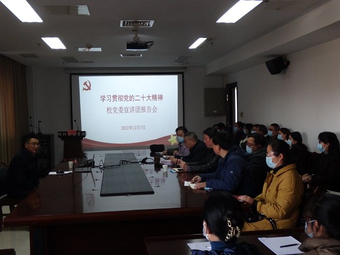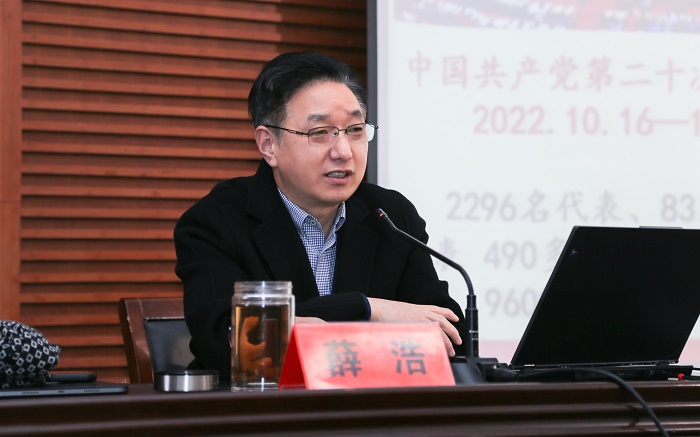 薛浩介绍了党的二十大的基本情况,从党的二十大的主题和主要成果、新时代10年的伟大变革、开辟马克思主义中国化时代化新境界的历史责任、中国式现代化的丰富内涵、全面建设社会主义现代化国家的目标任务、以党的自我革命引领伟大社会革命的重大要求、“三个务必”的谆谆教导和团结奋斗的时代要求、“两个确立”的决定性意义和实践要求等八个方面对党的二十大报告进行了系统阐释和深入解读。他强调,要把学习宣传贯彻党的二十大精神作为当前和今后一个时期的首要政治任务,要更加深刻领悟“两个确立”的决定性意义,增强“四个意识”、坚定“四个自信”、做到“两个维护”,弘扬伟大建党精神,坚持为党育人、为国育才,自觉把思想和行动统一到党的二十大精神上来,将党的二十大精神转化为推动学校、学院事业高质量发展的强大动力,为建设高水平一流应用型大学努力奋斗。