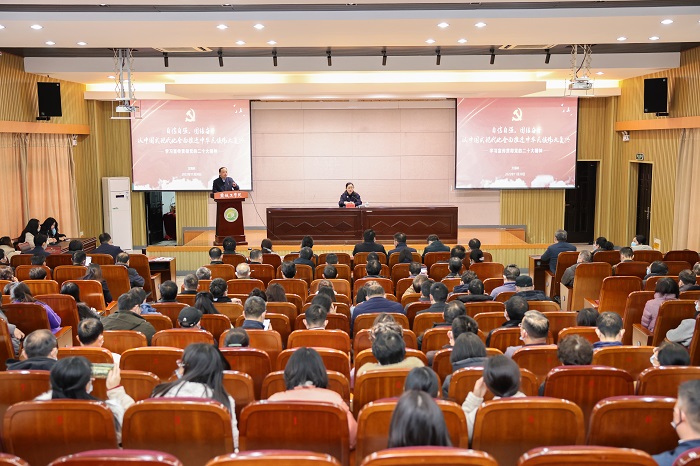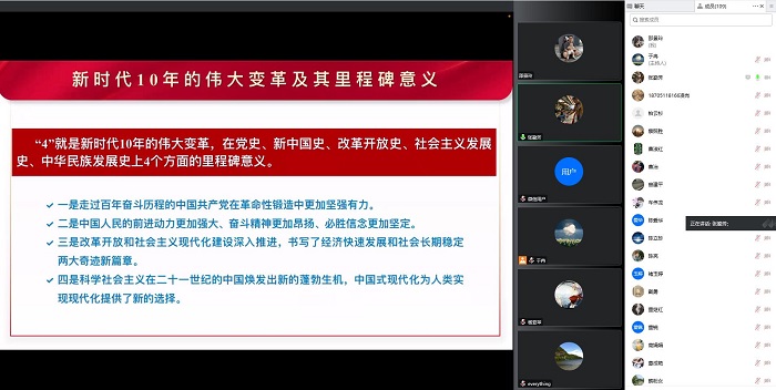 邵荣以“自信自强,团结奋斗,以中国式现代化全面推进中华民族伟大复兴——学习宣传贯彻党的二十大精神”为题,结合自己学习体会,联系学校实际,从党的二十大基本情况和深刻领会党的二十大的基本精神两方面切入展开,通过六个“深刻把握”和一个“深刻理解”对党的二十大精神进行全面、系统、深入地解读和阐释。他指出,党的二十大是在全党全国各族人民迈上全面建设社会主义现代化国家新征程、向第二个百年奋斗目标进军的关键时刻召开的一次十分重要的会议,是一次高举旗帜、凝聚力量、团结奋进的大会;党的二十大在政治上、理论上、实践上取得一系列重大成果。党的二十大报告,是党和人民智慧的结晶,是党团结带领全国各族人民夺取中国特色社会主义新胜利的政治宣和行动纲领,是马克思主义的纲领性文献。要从“牢牢把握过去5年工作和新时代10年伟大变革的重大意义,牢牢把握习近平新时代中国特色社会主义思想的世界观和方法论,牢牢把握以中国式现代化推进中华民族伟大复兴的使命任务,牢牢把握以伟大自我革命引领伟大社会革命的重要要求,牢牢把握团结奋斗的时代要求”五个方面全面深刻领会党的二十大精神的丰富内涵。