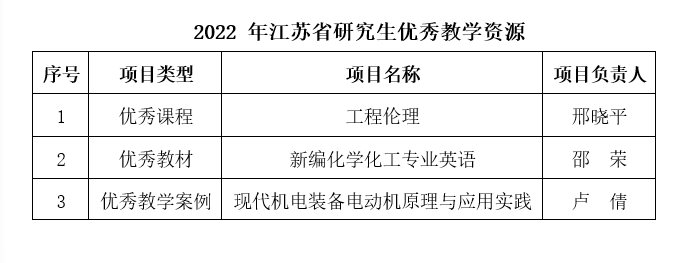 近日,江苏省教育厅公布2022年度江苏省研究生优质教学资源评选结果,我校获评江苏省研究生优秀课程1门、优秀教材1部、优秀教学案例1个。本次为江苏省首次评选研究生优质教学资源,全省共评选出100门研究生优秀课程、50部研究生优秀教材、100个研究生优秀教学案例。