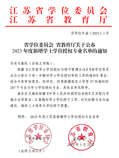 近日,江苏省学位委员会和江苏省教育厅下发《关于公布2023 年度新增学士学位授权专业名单的通知》(苏学位字函〔2023〕1号),我校新增的能源化学、应用统计学、光电信息科学与工程、智能装备与系统、数据科学与大数据技术5个专业获批为学士学位授权专业。