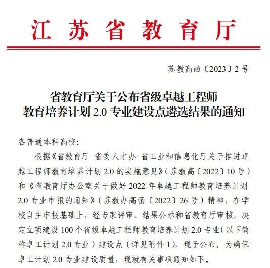 近日,江苏省教育厅公布了江苏省卓越工程师教育培养计划2.0专业建设点遴选结果,我校推荐申报的土木工程和食品科学与工程两个专业获评。卓越工程师教育培养计划2.0专业是江苏省教育厅引导高校以新工科建设为重要抓手,持续推进工程教育高质量发展,探索工程创新创业人才培养新模式,加快培养一批适应和引领江苏制造强省建设的卓越工程科技人才的重要举措。