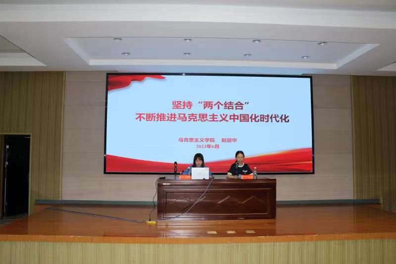 马克思主义学院副院长赵迎华作“坚持 ‘两个结合’,不断推进马克思主义中国化时代化”专题讲座。她通过朴实通俗的语言和生动翔实的事例,深入阐述了马克思主义中国化时代化的历史进程、“两个结合”的深刻内涵,系统解读了深刻理解“两个结合”的重大意义。