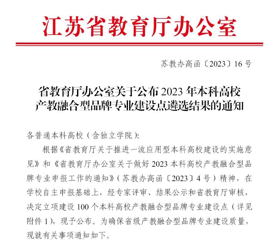 产教融合型品牌专业是江苏省教育厅引导高校主动面向区域、面向行业、面向产业办学,促进教育链、人才链与产业链、创新链有机衔接,深入推进产教协同育人的重要举措。