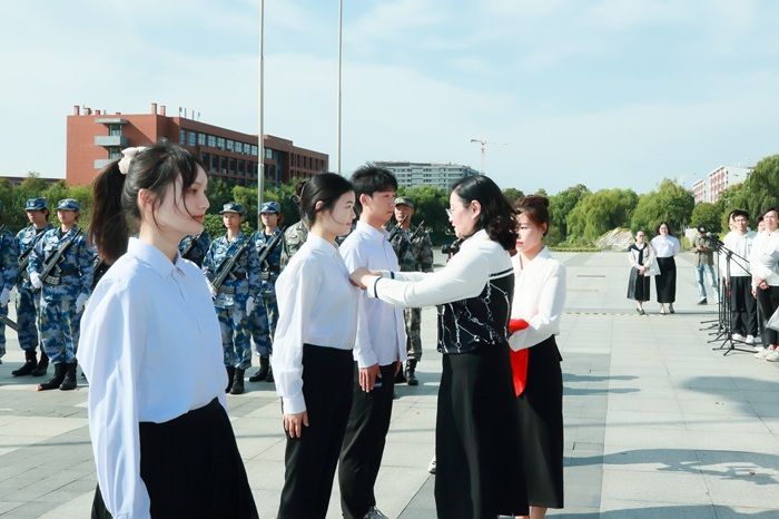 校党委书记方海林为新发展团员和党员代表佩戴团徽和党徽