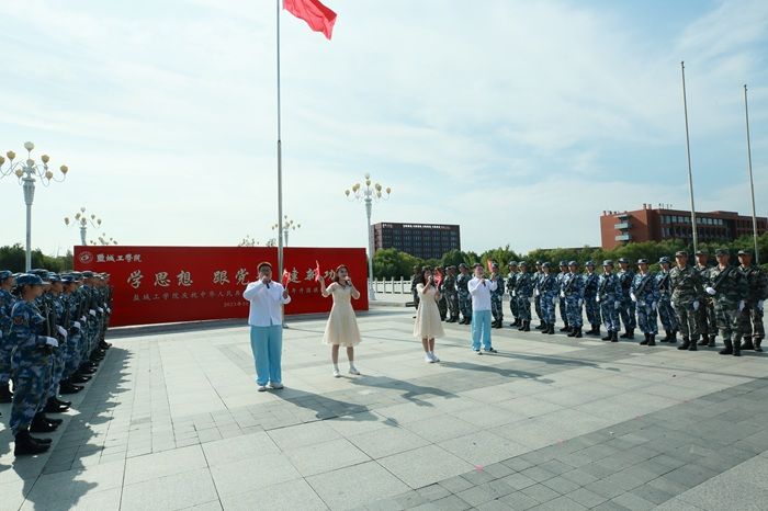 升旗仪式最后,全体师生随着节奏挥舞着手中的小国旗,深情唱响《我和我的祖国》,嘹亮的歌声唱出了盐工师生浓浓中国情、颗颗赤子心。