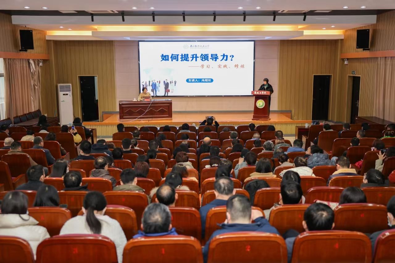 12月12日上午,学校在希望大道校区机械馆报告厅举办科级干部培训专家报告会,邀请南京航空航天大学冯绍红教授作《如何提高领导力》专题报告。校党委副书记薛浩出席,党委常委、组织部部长邢晓平主持报告会,全校科级干部、组织员等170余人参加。