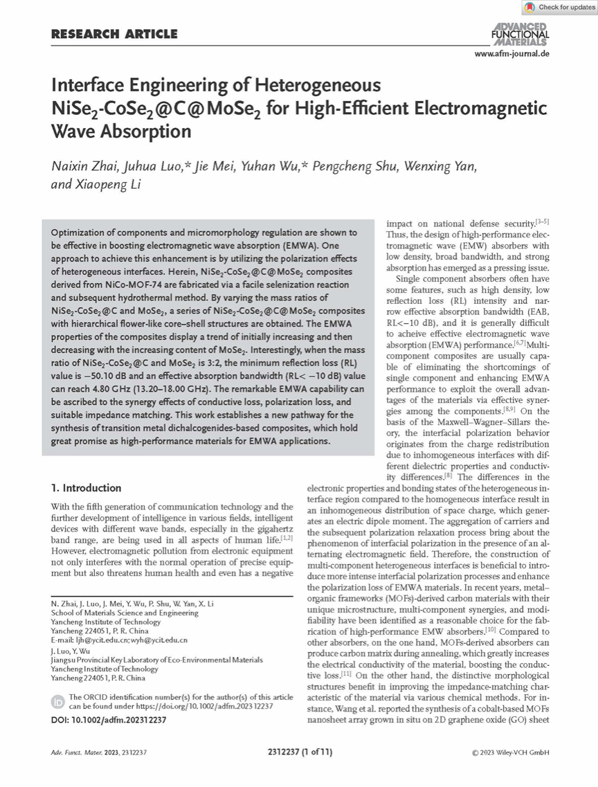 近日,我校材料学院罗驹华教授课题组在国际材料领域顶级期刊Advanced Functional Materials上发表题为“Interface Engineering of Heterogeneous NiSe2-CoSe2@C@MoSe2 for High-Efficient Electromagnetic Wave Absorption”的研究成果(https://doi.org/10.1002/adfm.202312237)。这是我校研究生首次为第一作者、盐城工学院为唯一通讯单位在此期刊发表研究论文。Advanced Functional Materials由Wiley出版,报道材料科学各个方面的突破性研究,包括纳米技术、化学、物理和生物,是国际公认的材料领域顶级专业期刊,在业界享有极高的声誉。2023年最新影响因子为19.924。