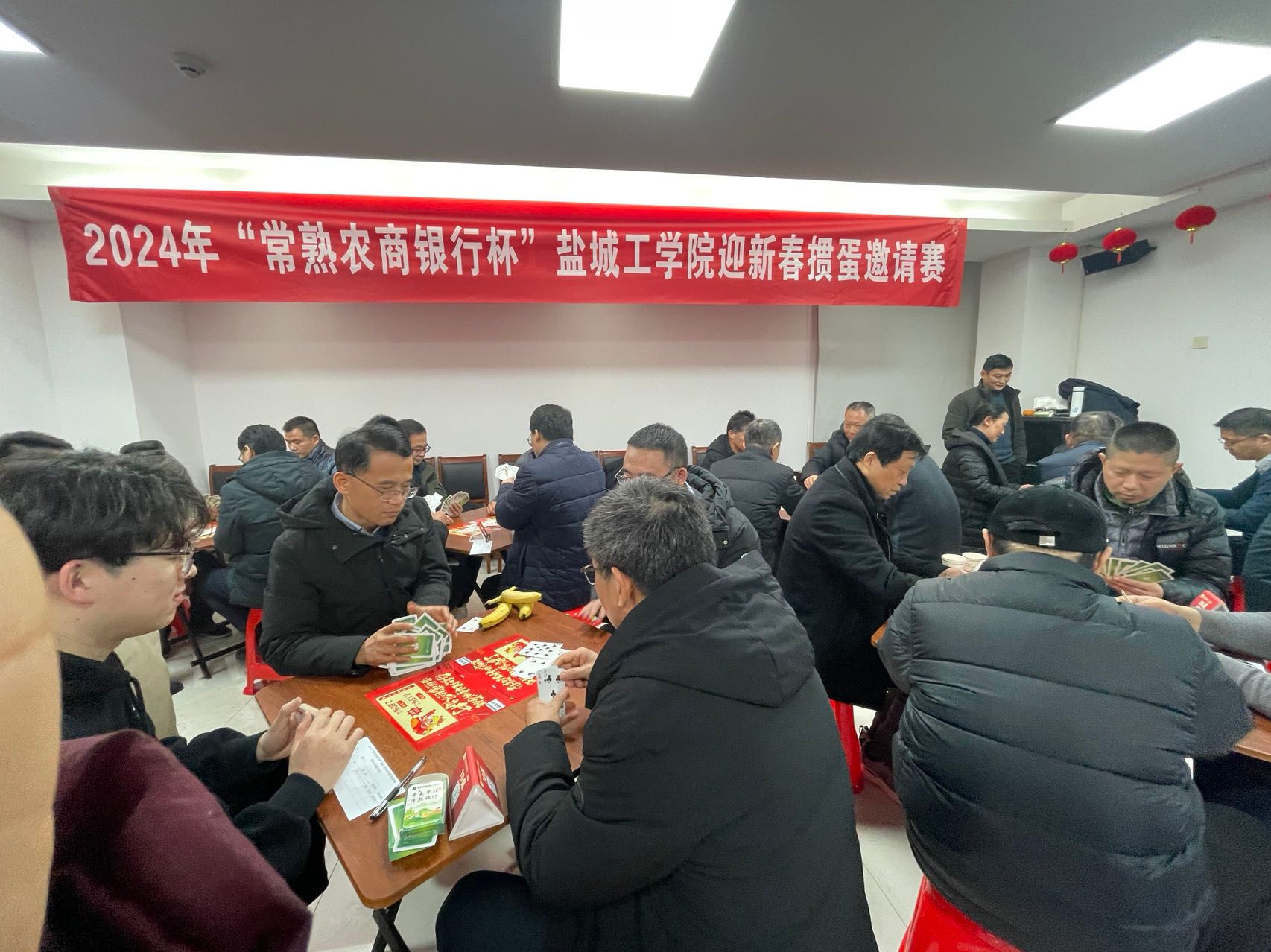 1月6日上午,2024年“常熟农商银行杯”盐城工学院迎新春掼蛋邀请赛在常熟农商银行亭湖支行二楼会议室举行,校党委常委、副校长王资生宣布比赛开始并为获特等奖选手颁奖,常熟农商银行亭湖支行行长宣维芳致欢迎词并为获一等奖选手颁奖。原校党委副书记、副校长张建祥,校党委常委、统战部部长姚军,校棋牌运动协会副会长杨汉华、周云峰等60位教职工和4位常熟农商银行亭湖支行员工应邀参赛。校棋牌运动协会会长谢毅敏主持开幕式和颁奖仪式,后勤保障集团副总经理李义峰担任比赛裁判长。
