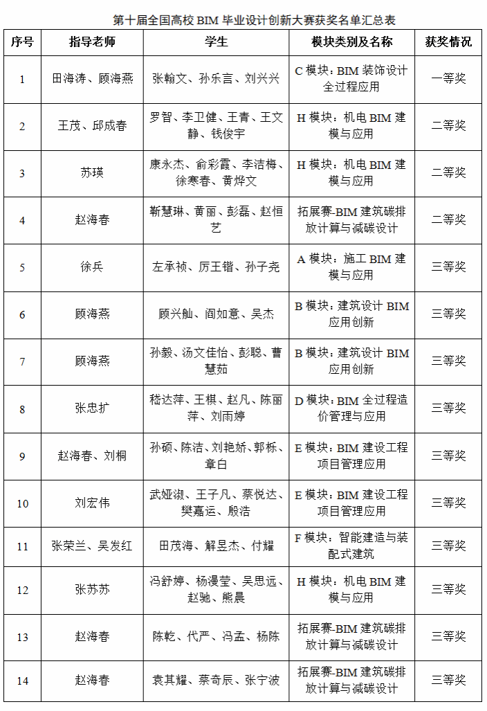 近日,第十届全国高校BIM毕业设计创新大赛组委会公布了BIM毕业设计创新大赛获奖名单。土木工程学院学子在激烈竞争中脱颖而出,获全国一等奖1项、二等奖3项、三等奖10项、优秀奖2项。其中,大赛一等奖团队(田海涛、顾海燕老师指导)将代表我校参加第十届全国高校BIM毕业设计创新大赛风采展示活动。