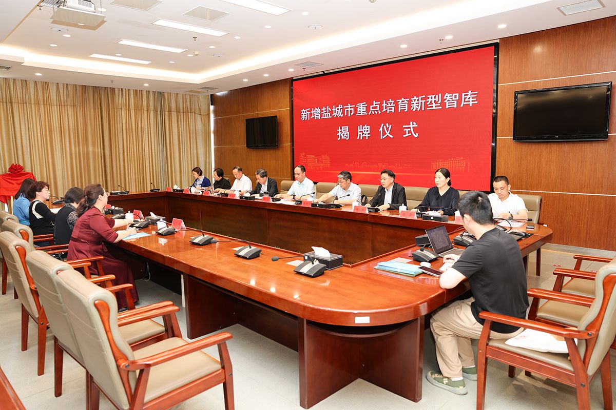 5月28日下午,学校在希望大道校区行政楼9楼视频会议室举行新增盐城市重点培育新型智库揭牌仪式。校长、党委副书记邵荣,校党委副书记薛浩,盐城市社科联党组书记、主席李晓奇,盐城市委统战部副部长、民族宗教事务局局长黄斌,亭湖区委统战部副部长、民宗局局长、侨办主任成莉,校党委常委、统战部部长姚军出席。社会科学处、人文社会科学学院、马克思主义学院相关人员和师生代表,江淮人文研究院、区域合作与中华民族共同体研究院负责人及智库成员代表等70余人参加。薛浩主持揭牌仪式。