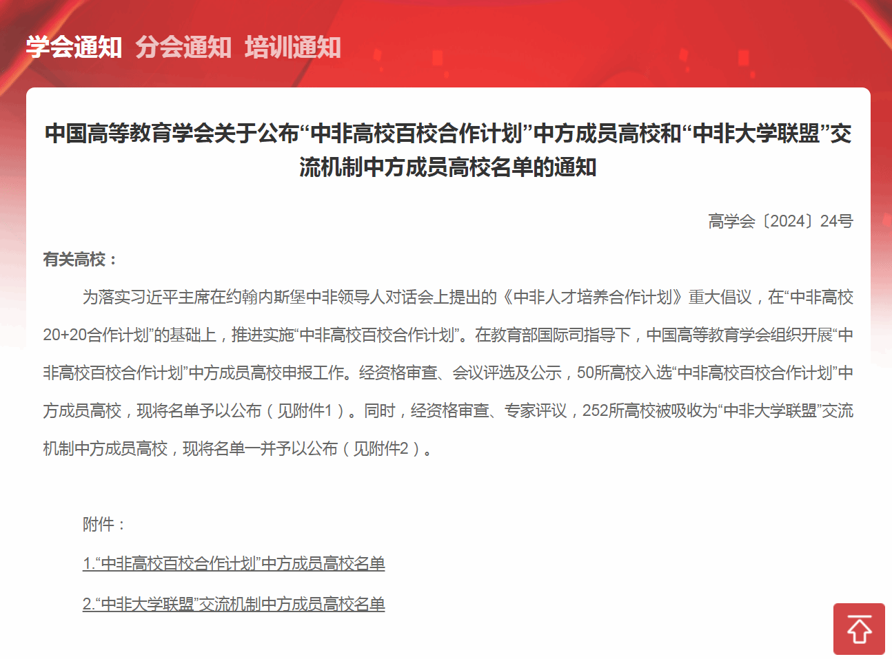 为落实习近平主席在约翰内斯堡中非领导人对话会上提出的《中非人才培养合作计划》重大倡议,搭建中非高校校际交流合作平台,推动中非高等教育共同发展,教育部国际司委托中国高等教育学会与非洲大学协会共建“中非大学联盟交流机制”,并在该机制框架下实施开展合作计划。经资格审查、会议评选及公示,我校入选“中非高校百校合作计划”中方成员高校。