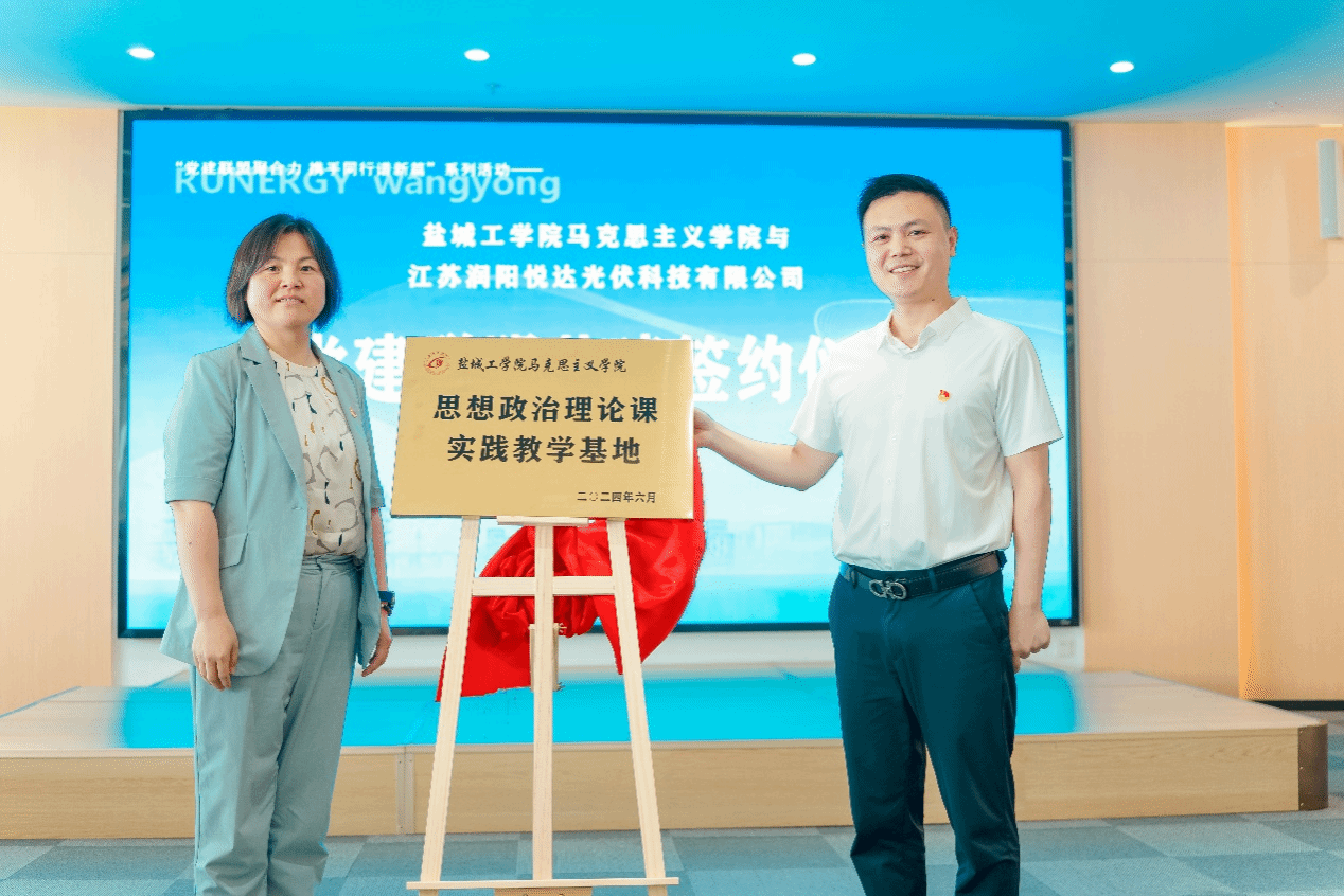 邢晓平与许可为“盐城工学院思想政治理论课实践教学基地”揭牌。共建活动上,江苏润阳新能源科技股份有限公司财务部副经理、党支部书记徐晶与我校社科处处长、马克思主义学院党总支书记、院长包雅玮签订结对共建协议。我校一行参观了润阳新能源三期及展览馆,“沉浸式”感受润阳新能源的发展历程、发展现状、发展前景。