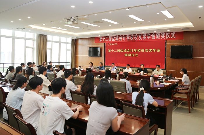 7月2日,学校在南校区行政楼九楼会议室举行第十二届盐城会计学校校友奖学金颁奖仪式,校党委常委、副校长、校友总会会长崔刚,杰出校友、盐城会计学校校友会会长、江苏熙熙国际控股集团有限公司董事长梁中宝,原盐城会计学校副校长、盐城工学院原基建处处长左元斌,原盐城会计学校副校长、盐城工学院原招投标办公室主任张中成,校长办公室、校友会办公室原副主任赵文彬等出席,经管学院学工办、团委负责人、获奖学生及部分学生骨干参加,经管学院党委书记卜树春主持。